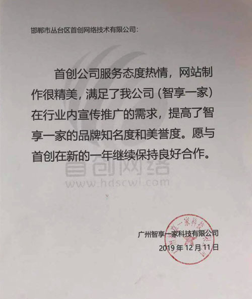 首創(chuàng)公司服務(wù)態(tài)度熱情,網(wǎng)站制作很精美,滿足了我公司(智享一家)在行業(yè)內(nèi)宣傳推廣的需求,提高了智享一家的品牌知名度和美譽度。